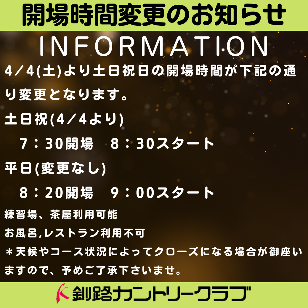 【土日祝日開場時間変更のお知らせ】 掲載日:2026年4月3日 4/4(土)~以下の通り土日祝日の開場時間が変更となります。宜しくお願い申し上げます。 土日祝(4/4~) 7:30開場 8:30スタート 平日(変更なし) 8:20開場 9:00スタート 釧路カントリークラブ
