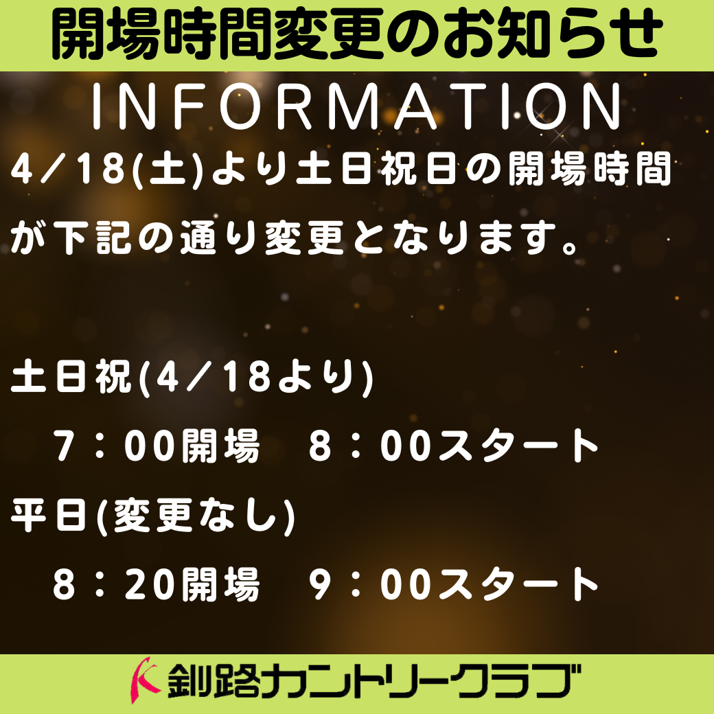 【土日祝日開場時間変更のお知らせ】 掲載日:2026年4月17日 4/18(土)~以下の通り土日祝日の開場時間が変更となります。宜しくお願い申し上げます。 土日祝(4/18~) 7:00開場 8:00スタート 平日(変更なし) 8:20開場 9:00スタート 釧路カントリークラブ
